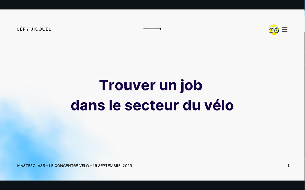 Suite à la masterclass du 16 septembre 2025 sur “Comment trouver un job dans le secteur du vélo”, j’ai rassemblé (et amélioré) toutes les ressources dans un guide Notion complet.